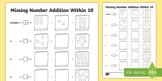 Math worksheets missing numbers to 10. Fractions Worksheets - Math-Drills Welcome to the fractions worksheets page at Math-Drills.com where the cup is half full! This is one of our more popular pages most likely because learning fractions is incredibly important in a person's life and it is a math topic that many approach with trepidation due to its bad rap over the years. ... Find the Missing Number Are These ... Free 1st Grade Math Worksheets - Homeschool Math Free Math Worksheets for Grade 1. This is a comprehensivedfdsffs collection of free printable math worksheets for grade 1, organized by topics such as addition, subtraction, place value, telling time, and counting money. ... Adding two single-digit numbers - sum 10 or less; Missing addend - sums with 6; Missing addend - sums with 7; Missing ... Browse Printable Kindergarten Math Worksheets | Education.com Our kindergarten math worksheets do just that, with professionally designed coloring, tracing, and number counting pages that feature familiar images and quirky characters. From simple addition and subtraction to sorting and identifying coins, our kindergarten math pages assist young learners with building fundamental math skills. Grade 2 Math Worksheets, Math Worksheet For Class 2 We also have grade 2 math subtraction worksheets covering varied topics like subtracting with and with carrying, subtraction of large numbers and subtraction word problems. It gets even more interesting with activities on telling time; children can start with the telling time worksheet grade 2 which contains clock faces with the hour and minute ...